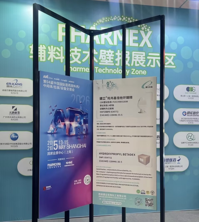 Xi'an Deli Biochemical Industry Co., Ltd. a participé à l'exposition API Chine 2025 qui s'est tenue à Chongqing, présentant les produits phares de l'entreprise :Hydroxypropyl Betadex (HPBCD)etBetadex Sulfobutyl Éther Sodique (SBECD)—aux professionnels mondiaux de l’industrie pharmaceutique et chimique.