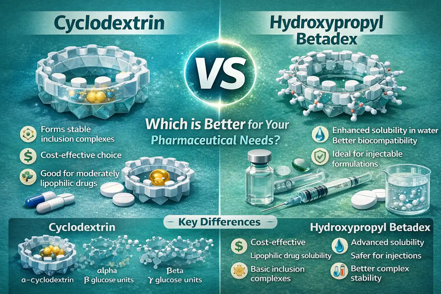 Les deux excipients fonctionnent bien dans les formules à libération contrôlée, mais ils sont utilisés de différentes manières en fonction des besoins de l'industrie pharmaceutique. La cyclodextrine peut être utilisée sous forme orale, topique et dans certaines formes injectables, et l'hydroxypropyl bêtadex peut être utilisé pour améliorer l'administration parentérale de médicaments.