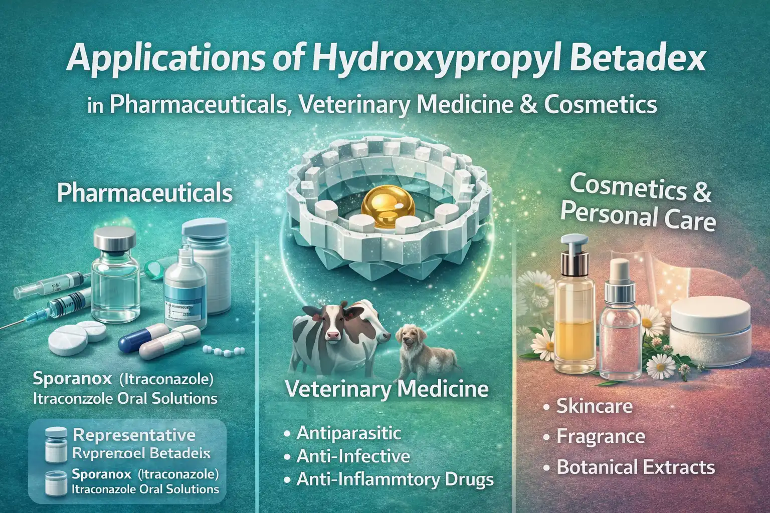 En médecine vétérinaire, l'Hydroxypropyl Betadex est utilisé pour améliorer les performances des médicaments antiparasitaires, anti-infectieux et anti-inflammatoires peu solubles.