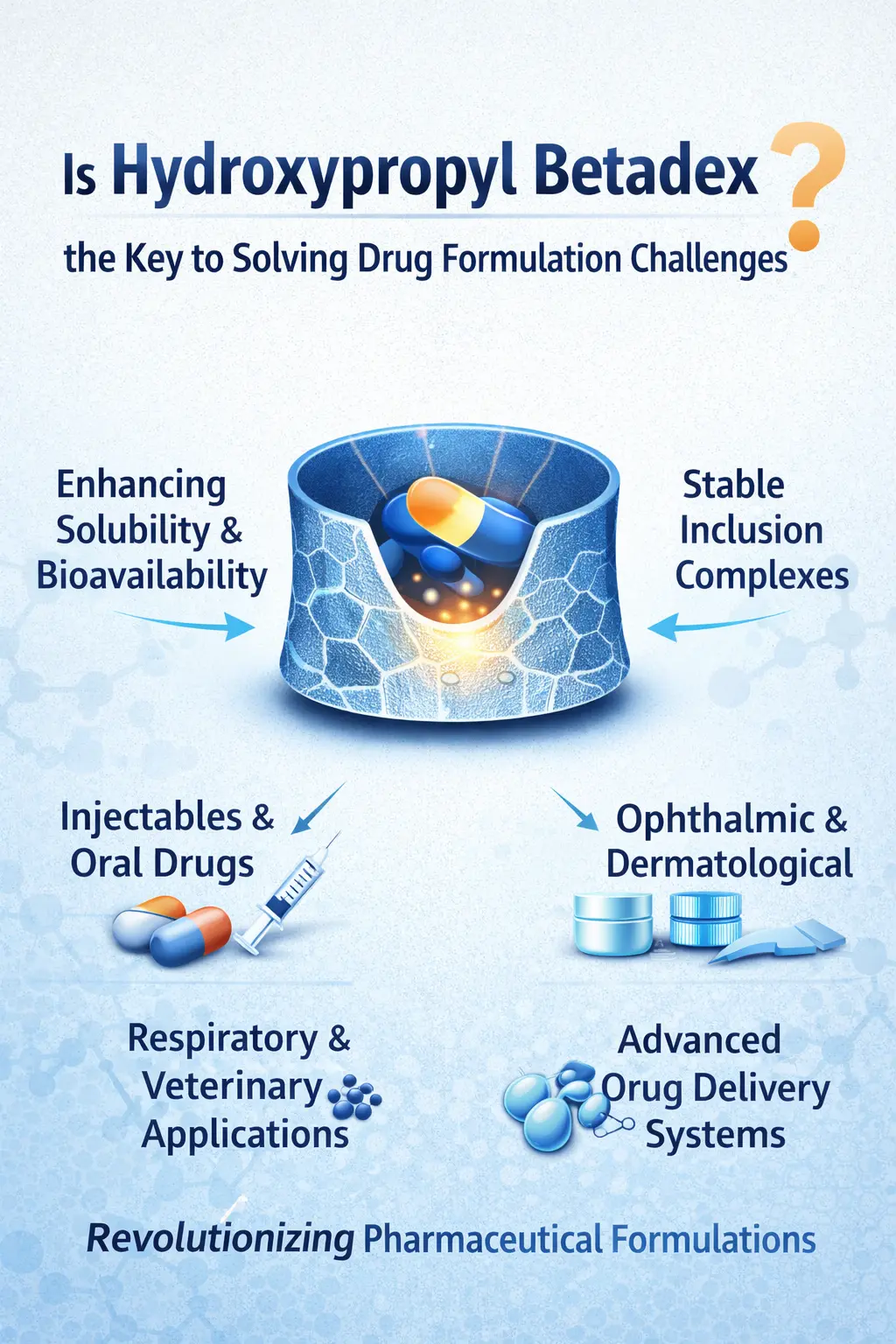 C'est vrai queHydroxypropyl Betadexest la clé pour résoudre bon nombre des problèmes qui surviennent lors de la fabrication de nouveaux médicaments. Ses qualités d’emballage moléculaire uniques, son profil de sécurité élevé et son large éventail d’utilisations en font aujourd’hui un outil essentiel pour les scientifiques pharmaceutiques. Ce produit à base de cyclodextrine change la science de la préparation pharmaceutique à bien des égards, par exemple en rendant les médicaments qui ne se dissolvent pas facilement plus biodisponibles et en permettant de nouvelles façons d'administrer les médicaments. La substance a un historique de succès dans les utilisations injectables, orales et spécialisées, ce qui montre à quel point elle est utile pour répondre à des besoins de préparation complexes tout en assurant la sécurité des patients et l’efficacité du traitement.