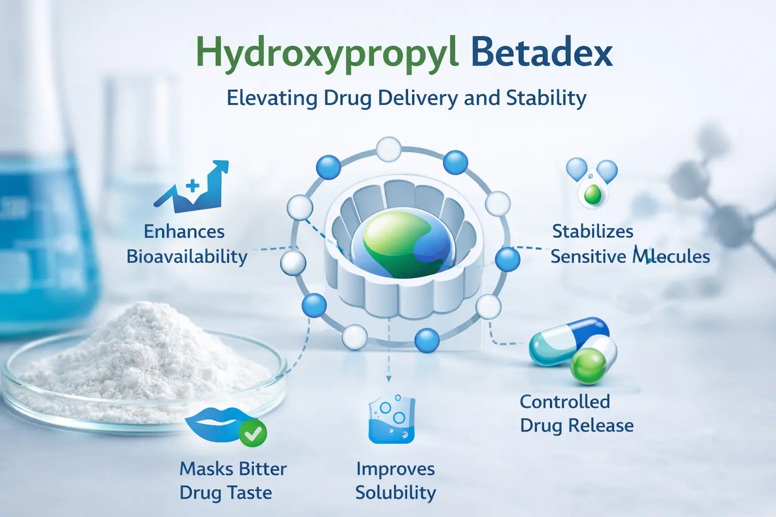 Grâce à la libération contrôlée, les formulateurs peuvent modifier la manière dont les médicaments sont libérés sans avoir à recourir à des méthodes de délivrance compliquées. L'hydroxypropyl Betadex peut modifier la façon dont la molécule invitée interagit avec la molécule hôte pour obtenir des modèles de libération instantanés, soutenus ou ciblés. Cette polyvalence réduit le temps nécessaire à la création de nouveaux médicaments et permet aux patients de suivre plus facilement leurs plans de dosage, ce qui améliore l'observance.